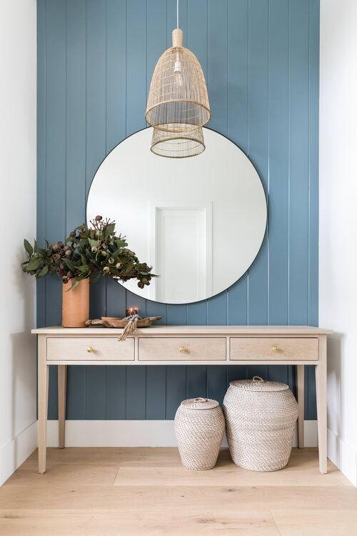 Natural materials like seagrass and bamboo also shine through in decorative accessories throughout the home. For a classy coastal look, avoid overt seaside references like anchors and seashells, and opt for items like woven baskets, boho mirrors, blue glass vases, and jute rugs.