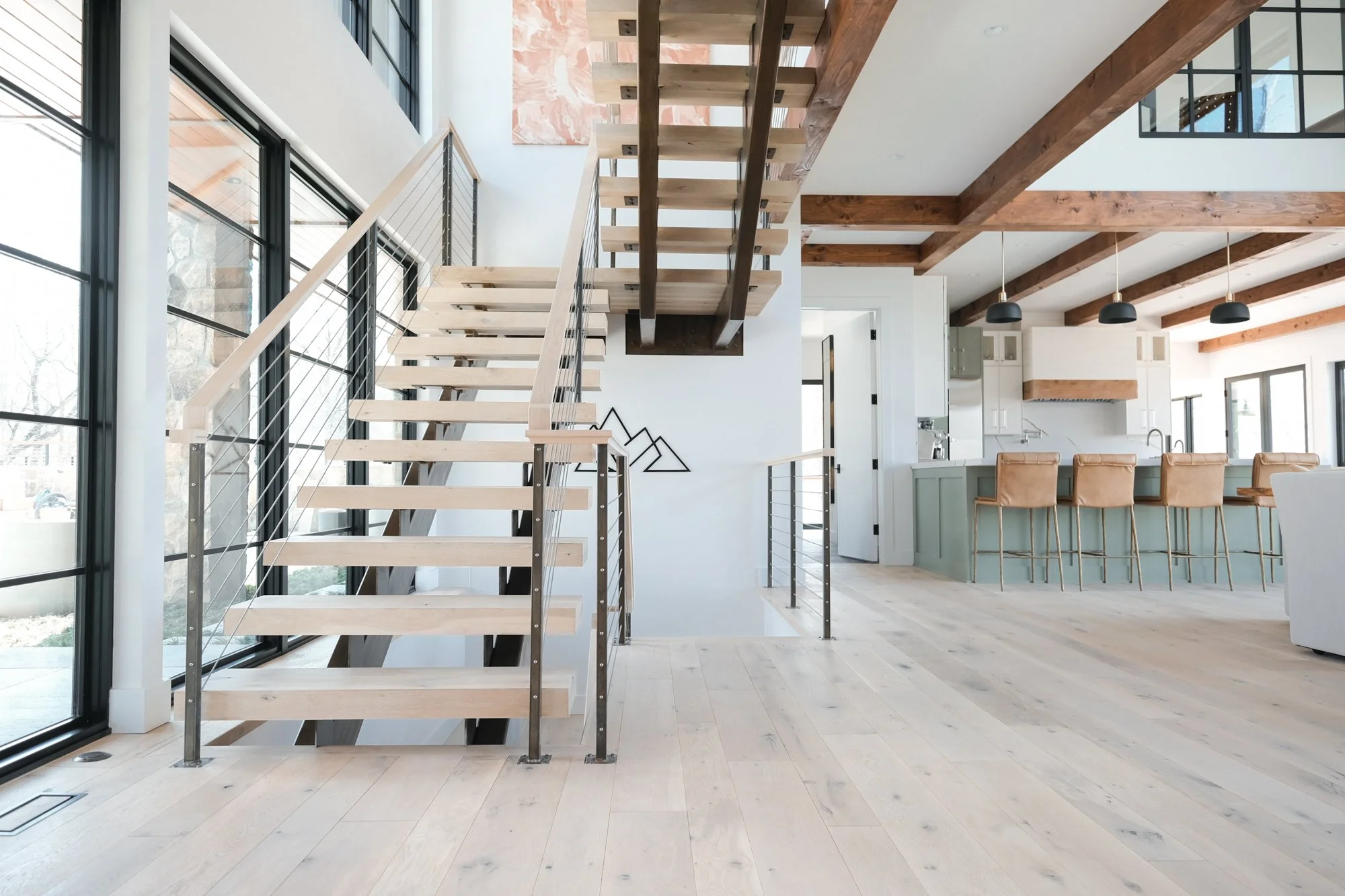 Upstairs, a beautiful open landing creates a walkway between the upper rooms. Clean lines and blond wood are accented with rustic, western-style pieces like barn doors and an antler chandelier, warming up an otherwise hard aesthetic.