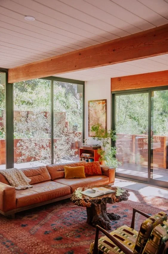 The biggest appeal of midcentury living spaces is their inviting warmth and natural light, which you can recreate at home with earthy tones and big open windows. Remove unnecessary window dressings to let light in, opening up to the nature outside. Natural materials, especially teak and leather, are also crucial in tying this look together.