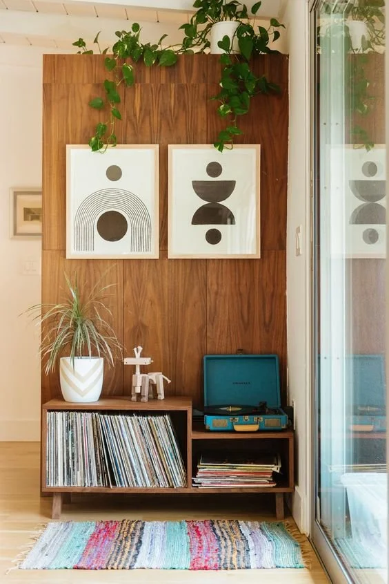 Add a warm wooden wall treatment to recreate that warm, earthy look in your living room. This could be genuine wood, composite, or even a peel-and-stick wallpaper!