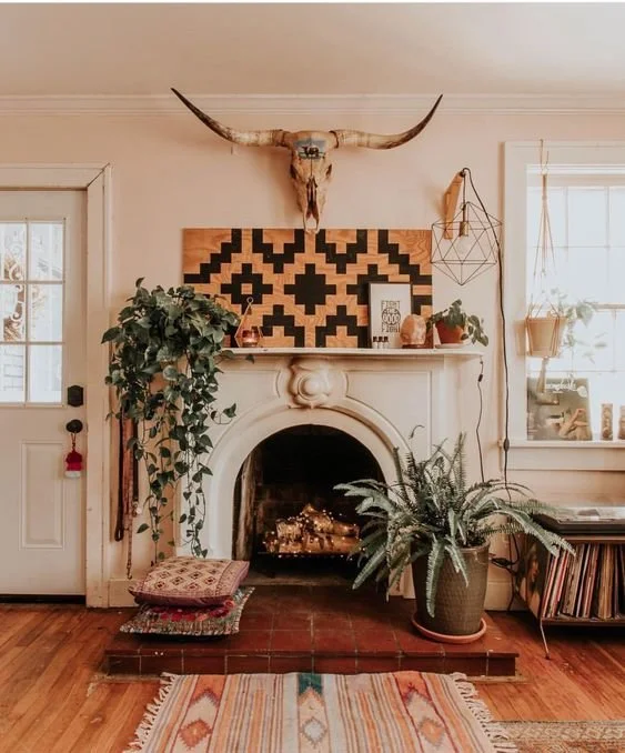 A boho chic fireplace makes a great focal point for smaller interior spaces. Surround your fireplace with cute accents like hanging plants, dried flowers, soft furnishings, and ceramic vases. If you can’t light a fire, no problem, try filling it with natural wood and fairy lights or candles in jars to recreate the warmth and glow.
