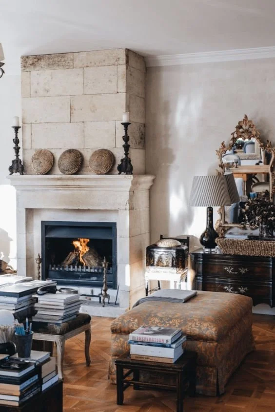 Create a luxury log cabin feeling by surrounding your fireplace with stone or brick accents. An old stone wall or a stone facade makes a great backdrop for a real log fire, especially when complemented by natural wood and plenty of beautiful vintage soft furnishings.