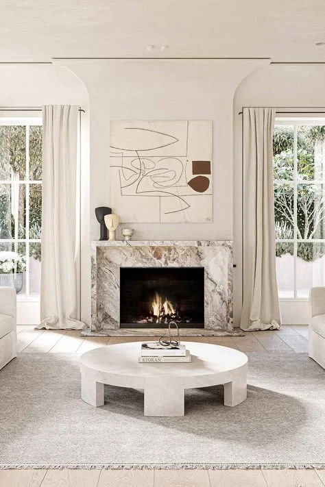 For a chic yet homely feeling, mix clean neutral tones with modern touches. We love a minimalistic fireplace set amidst a simple yet stunning marble, tile, stone, or brick hearth, matched in tone by an area rug and some mid-century furnishings. Check out our ideas for more amazing midcentury modern living rooms.